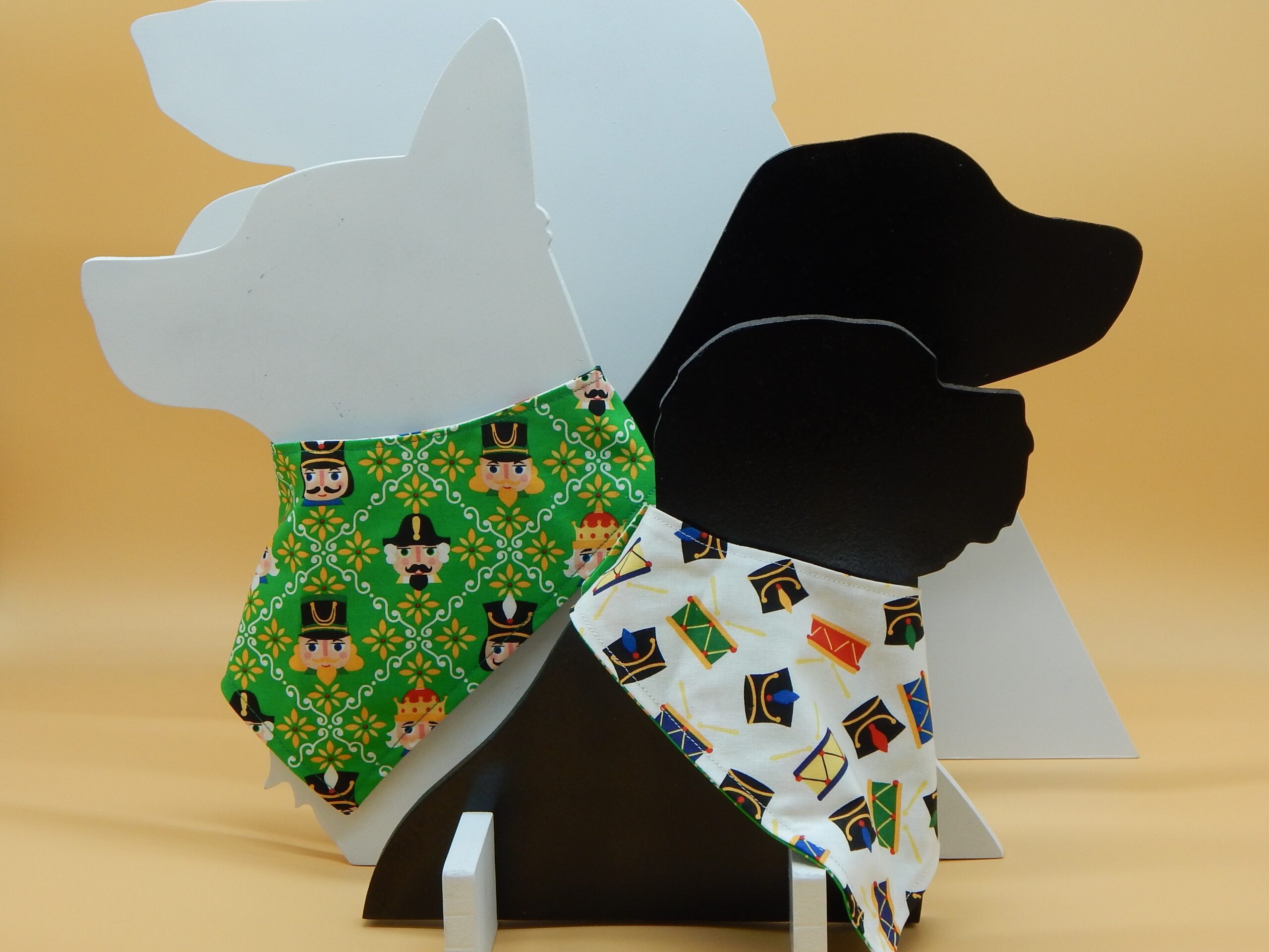 Nutcracker heads are enclosed with diamond shaped filigree on the front while drums and hats are tossed about on the back. Bandana is reversible.