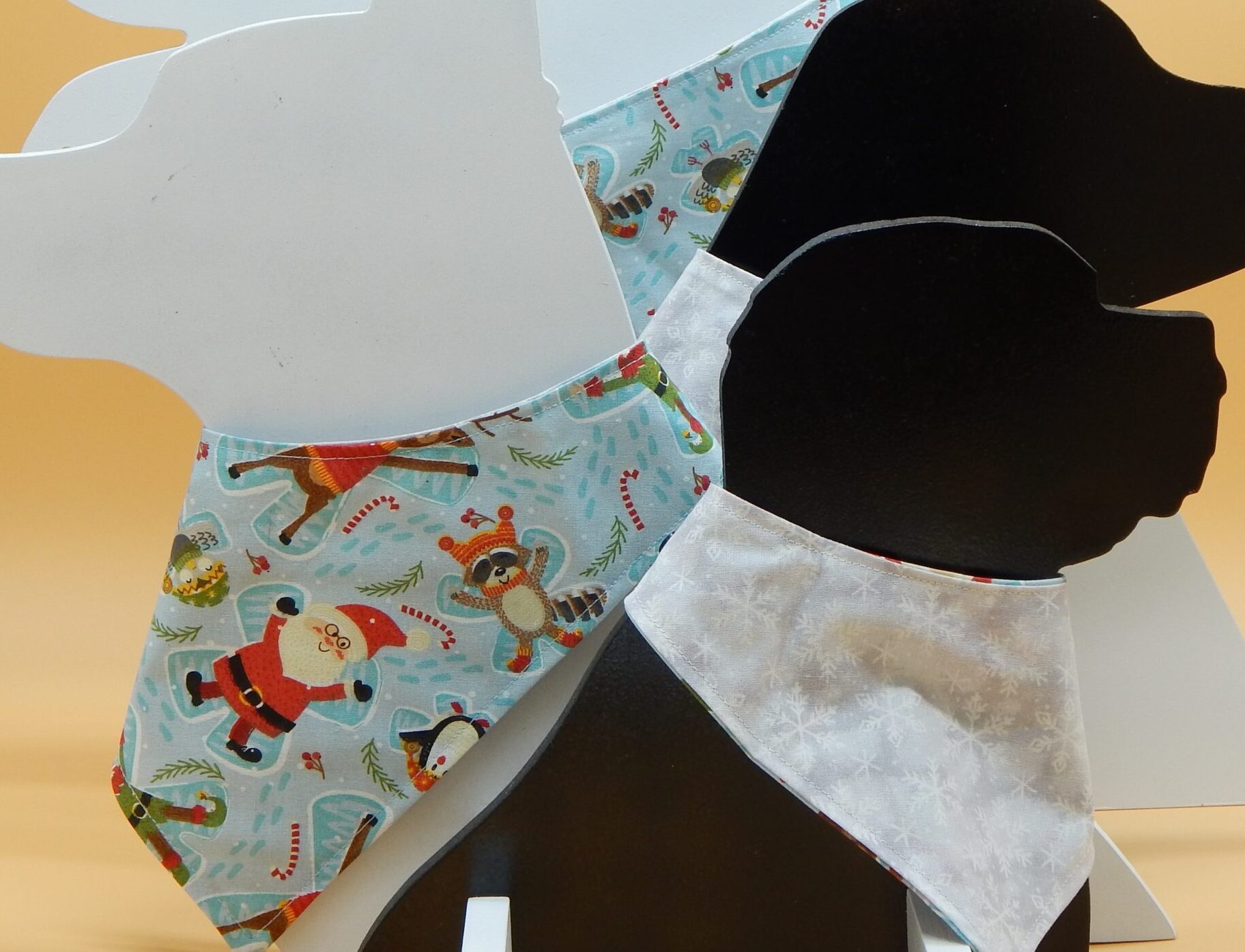 Santa, Elves and animals alike create snow angels on the front while a blanket of snow covers the back. Bandana is reversible.