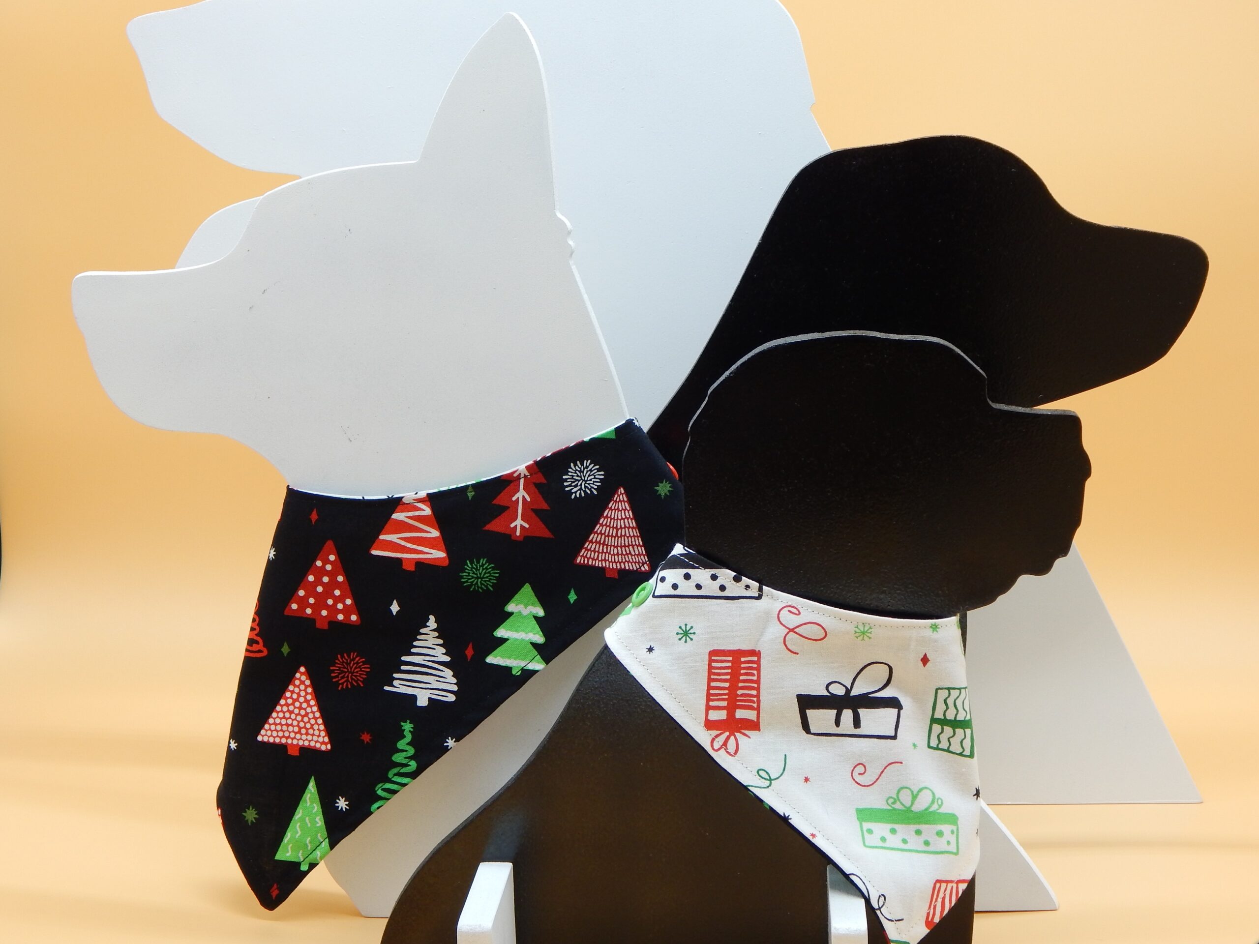 Green, red and white Christmas trees adorn a black backdrop while the back is a contrasting white with multi-colored presents. Bandana is reversible.